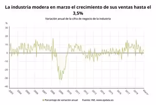 La cifra de negocios de la industria creció un 3,5% el pasado mes de marzo respecto al mismo mes de 2018, mientras que las entradas de pedidos del sector avanzaron un 3,1%, según datos difundidos este miércoles por el Instituto Nacional de Estadística (INE).