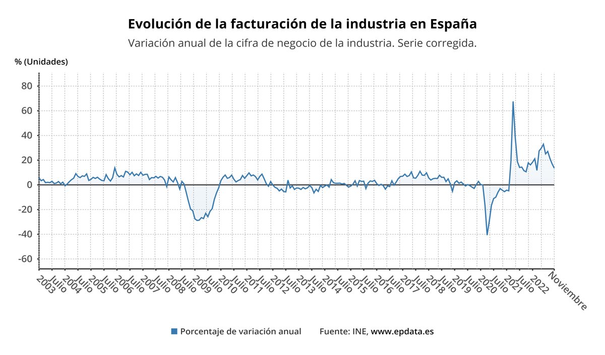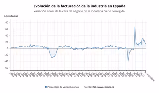 No obstante, el avance interanual de noviembre es 3,5 puntos inferior al registrado en octubre y el menos pronunciado desde marzo de este año. Pese a ello, la facturación de la industria suma ya 21 meses consecutivos de ascensos tras haber encadenado anteriormente un año de tasas interanuales negativas por la crisis del Covid.