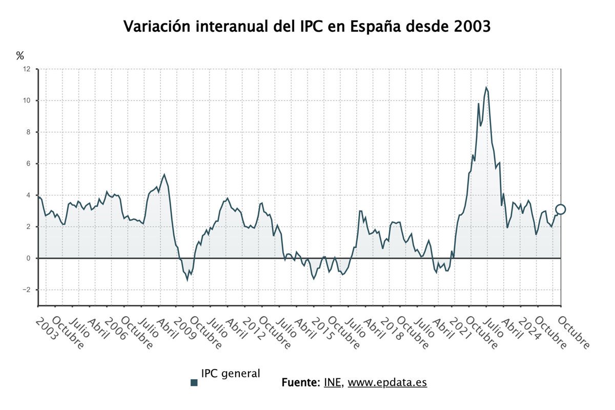 Con este repunte de una décima en el décimo mes del año, el IPC interanual encadena dos meses consecutivos de ascensos después de que en septiembre subiera tres décimas, hasta el 3%.