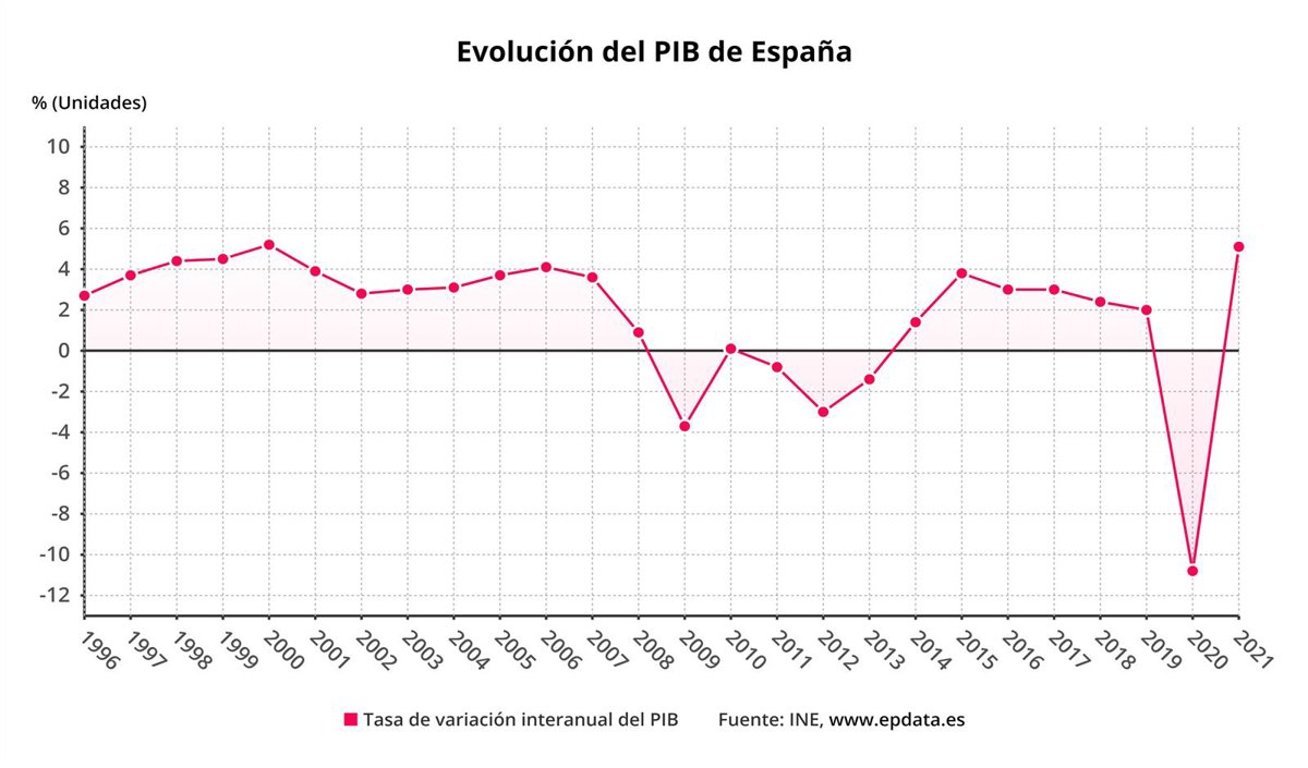 Con el crecimiento del 5,1% logrado el año pasado, la economía española regresa a tasas positivas anuales después de que la irrupción del coronavirus provocara en 2020 un descenso histórico del PIB del 10,8%.