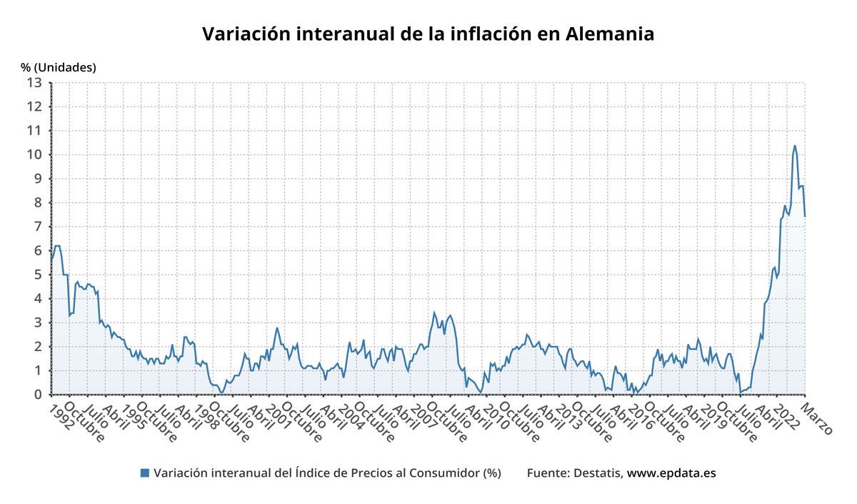 El índice de precios al consumo (IPC) de Alemania se situará en el 7,4% en el mes de marzo, según la estimación preliminar de la Oficina Federal de Estadística (Destatis), lo que supone la menor subida interanual de los precios desde abril del año pasado, después del alza del 8,7% observado en los meses de febrero y enero de 2023.