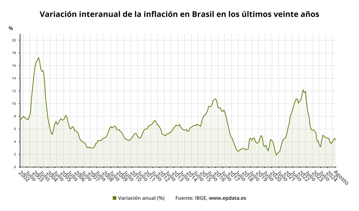 En este contexto, cabe señalar que el Banco Central de Brasil decidió en su última reunión, celebrada a inicios de agosto, mantener los tipos de interés sin cambios, en el 10,5%, destacando que el incierto escenario global y el escenario interno de inflación exigen "un seguimiento diligente y una cautela aún mayor".