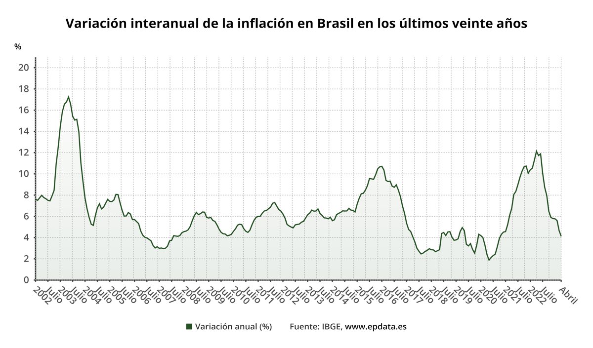 El Índice de Precios al Consumidor (IPC) de Brasil se situó en el 4,12% interanual en el mes de abril, lo que supone una caída de más de medio punto respecto al dato de marzo (4,65%), alcanzando su cifra más baja desde octubre de 2020.
