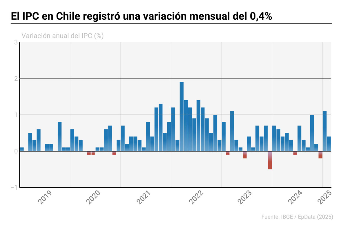 De esta forma, la inflación chilena retoma la senda descendente, después de registrar dos meses de subidas, y regresa al nivel de octubre de 2024, cuando se registró también un índice interanual del 4,7%.