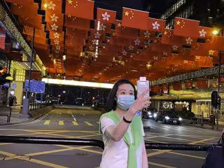 29 June 2021, China, Hong Kong: A woman takes a selfie near China's national flags and the flags of the Hong Kong Special Administrative Region to mark the 24th anniversary of Hong Kong's handover to China. Photo: Dominic Chiu/SOPA Images via ZUMA Wire - Dominic Chiu/SOPA Images via ZUM / DPA