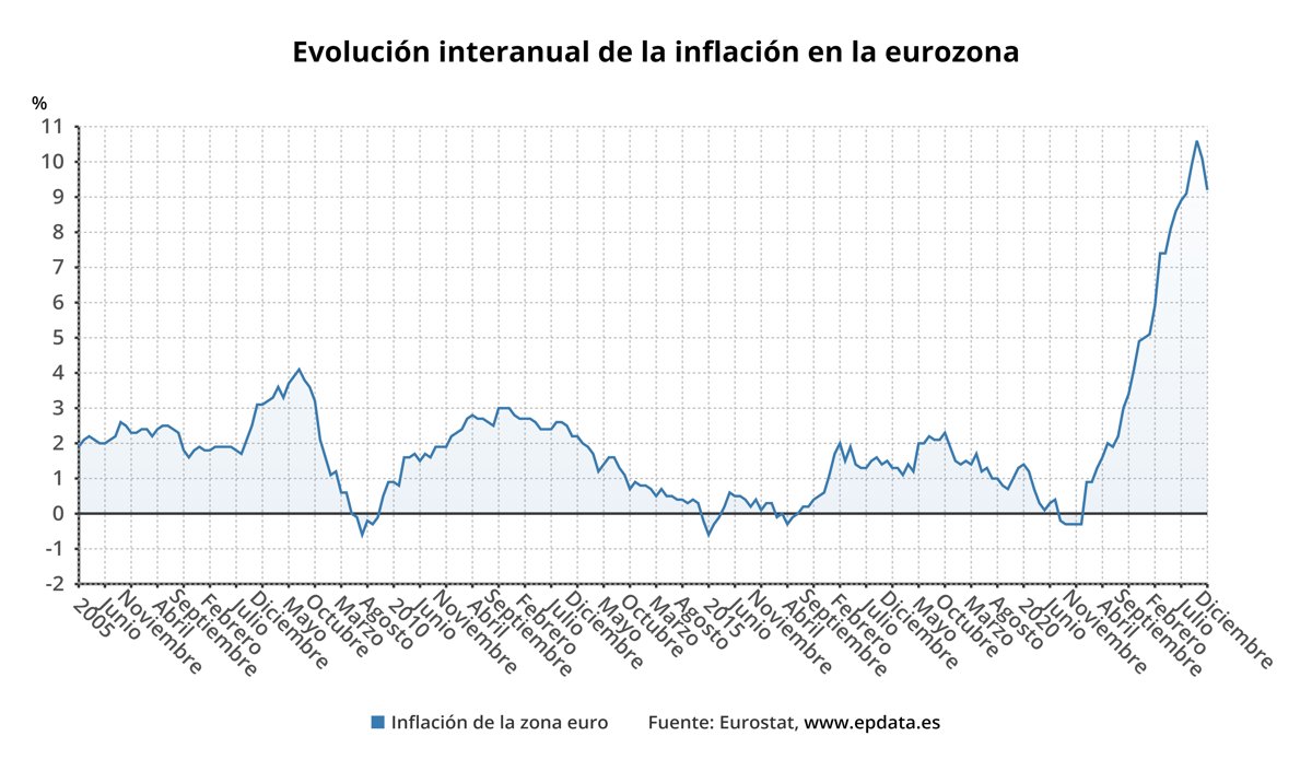 La tasa de inflación interanual de la eurozona se ha situado en diciembre en el 9,2%, lo que implica una bajada de nueve décimas frente al 10,1% de noviembre, según la información preliminar publicada por la oficina comunitaria de estadística, Eurostat, que señala a España como el país de la eurozona donde los precios subieron con menor intensidad, con un 5,6%.