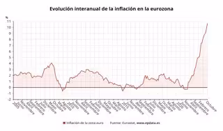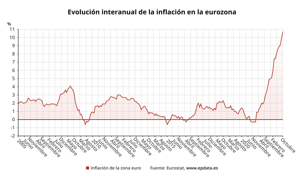 La tasa de inflación interanual de la eurozona se ha situado en octubre en el 10,7%, lo que marca un nuevo récord histórico y supone una aceleración de ocho décimas respecto al dato de septiembre, a pesar de las subidas de los tipos de interés acometidas por el Banco Central Europeo (BCE), según la primera estimación publicada por la oficina comunitaria de estadística.