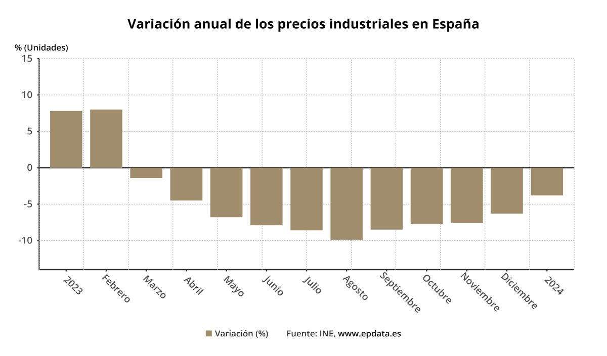 Los precios industriales disminuyeron un 3,8% el pasado mes de enero en relación al mismo mes de 2023, moderando en 2,5 puntos el descenso registrado el pasado mes de diciembre, según ha informado este lunes el Instituto Nacional de Estadística (INE).