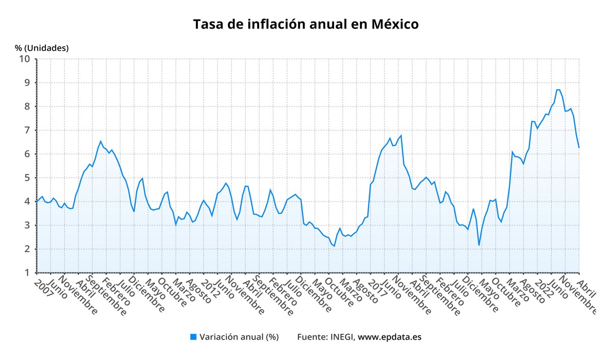 El Índice Nacional de Precios al Consumidor (INPC) de México cayó seis décimas en abril respecto al mes anterior, hasta situarse en el 6,25% interanual, según ha divulgado este martes el Instituto Nacional de Estadística y Geografía (Inegi) de México.