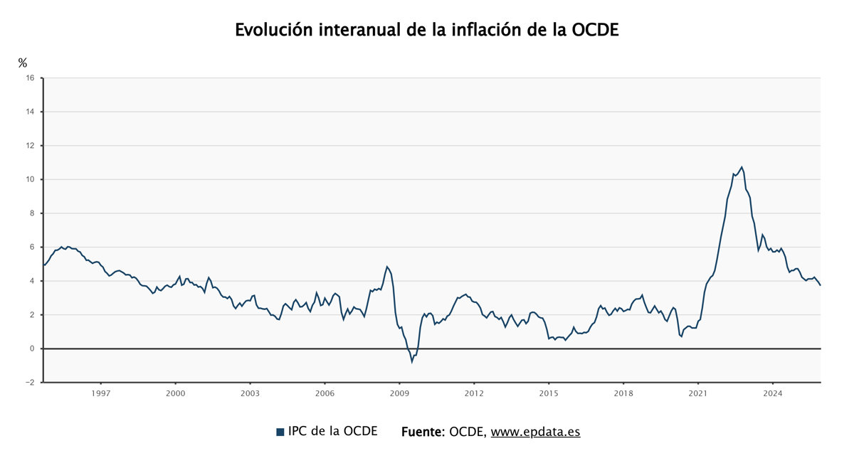 La tasa de inflación interanual de la Organización para la Cooperación y el Desarrollo Económico (OCDE) se situó el pasado mes de diciembre en el 3,7%, una décima menos que en noviembre, aunque el dato mostró que los precios estuvieron casi un 36% por encima de los del mismo mes de 2019, antes del estallido de la pandemia.