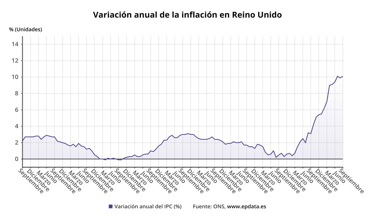 La tasa de inflación interanual del Reino Unido se situó el pasado mes de septiembre en el 10,1%, frente al 9,9% registrado en agosto, volviendo así al nivel máximo que se había observado también en julio y que representa el mayor incremento de los precios desde 1982, según informó este miércoles la Oficina Nacional de Estadística británica (ONS, por sus siglas en inglés).