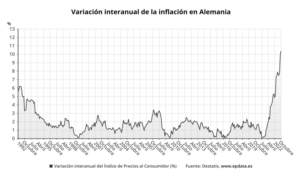 El dato interanual de inflación del 10,4% supone un nuevo máximo histórico para el país desde que hay registros en la Alemania reunificada, después de que la subida de precios del 10% de septiembre ya hubiera sido el mayor encarecimiento de los precios desde 1991.