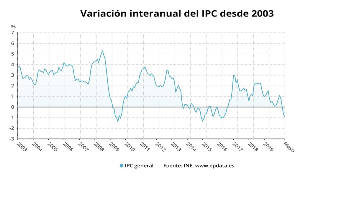 El Índice de Precios de Consumo (IPC) no experimentó cambios en mayo en relación al mes anterior, pero recortó dos décimas su tasa interanual, hasta el -0,9%, su mayor tasa negativa desde mayo de 2016, según los datos publicados este viernes por el Instituto Nacional de Estadística (INE).