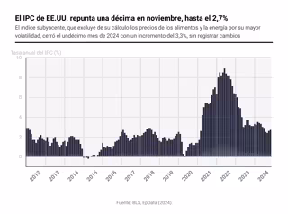 No obstante, el índice subyacente, que excluye de su cálculo los precios de los alimentos y la energía por su mayor volatilidad, cerró el undécimo mes de 2024 con un incremento del 3,3%, sin cambios. Después, los alimentos se encarecieron un 2,4% interanual, mientras que la energía fue un 3,2% más barata que doce meses antes.