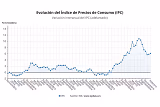 El Índice de Precios de Consumo (IPC) subió un 1% en febrero en relación al mes anterior y elevó dos décimas su tasa interanual, hasta el 6,1%, por el encarecimiento de la energía y los alimentos, según los datos avanzados publicados este martes por el Instituto Nacional de Estadística (INE).