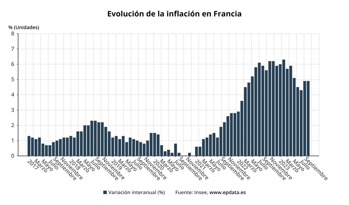 El Índice de Precios de Consumo (IPC) de Francia se situó en septiembre en el 4,9% interanual, idéntica cifra a la del mes anterior, aunque en términos puramente mensuales la métrica retrocedió medio punto porcentual, según ha confirmado este viernes el Instituto Nacional de Estadística y Estudios Económicos (Insee).