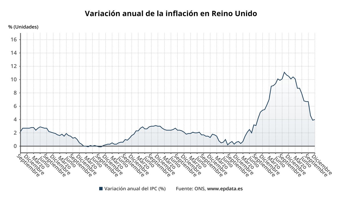 La tasa de inflación interanual del Reino Unido se situó el pasado mes de diciembre en el 4%, una décima por encima del 3,9% de noviembre, lo que representa el primer repunte de los precios en la segunda mayor economía europea desde febrero de 2023, según los datos publicados por la Oficina Nacional de Estadística (ONS).