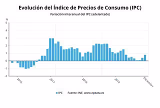 El Índice de Precios de Consumo (IPC) bajó un 0,1% en diciembre en relación al mes anterior y elevó cuatro décimas su tasa interanual, hasta el 0,8%, su valor más alto desde mayo, según el indicador adelantado publicado este lunes por el Instituto Nacional de Estadística (INE).