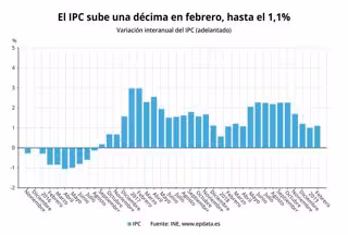 La tasa interanual de febrero es la trigésima tasa positiva que encadena el IPC interanual e implica que los precios son hoy un 1,1% superiores a los de hace un año.
