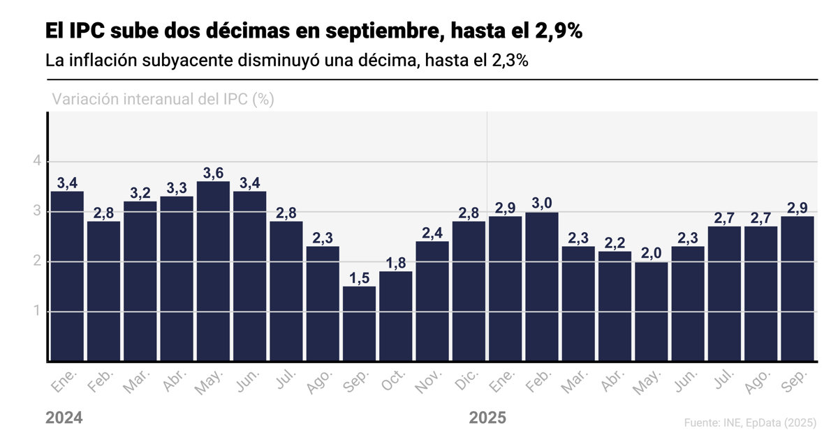 El Índice de Precios de Consumo (IPC) elevó su tasa interanual en septiembre dos décimas, hasta el 2,9%, su nivel más alto desde el pasado mes de febrero, debido a que los precios de los carburantes y la electricidad bajaron menos que en igual mes de 2024, según los datos avanzados este lunes por el Instituto Nacional de Estadística (INE).