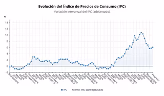 El Índice de Precios de Consumo (IPC) subió un 0,9% en febrero en relación al mes anterior y elevó una décima su tasa interanual, hasta el 6%, por el encarecimiento de la electricidad, de los paquetes turísticos y de los alimentos, que dispararon sus precios un 16,6% interanual, su mayor alza desde 1994, según los datos definitivos publicados este martes por el Instituto Nacional de Estadística (INE).
