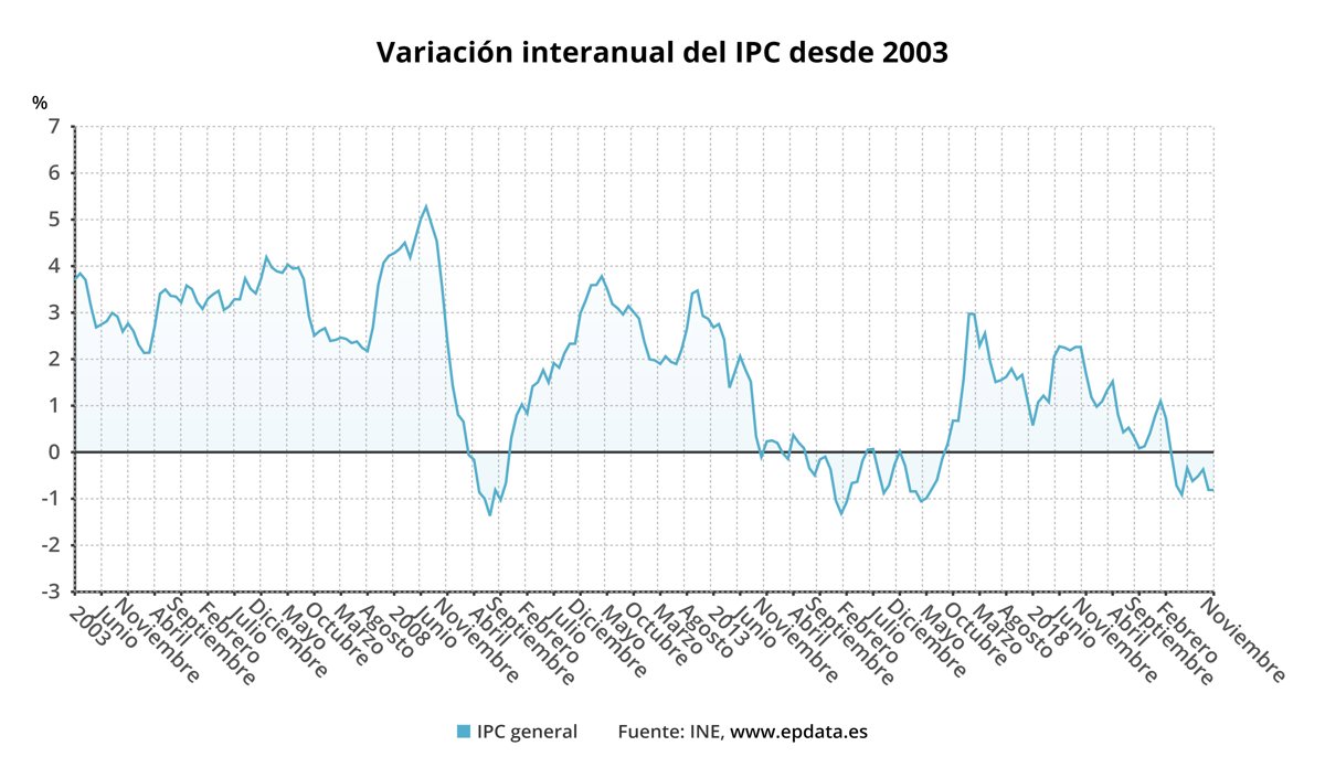 Con el dato de noviembre, el IPC interanual encadena su octava tasa negativa consecutiva, según los datos definitivos publicados este viernes por el Instituto Nacional de Estadística (INE), que coinciden con los avanzados a finales del mes pasado.