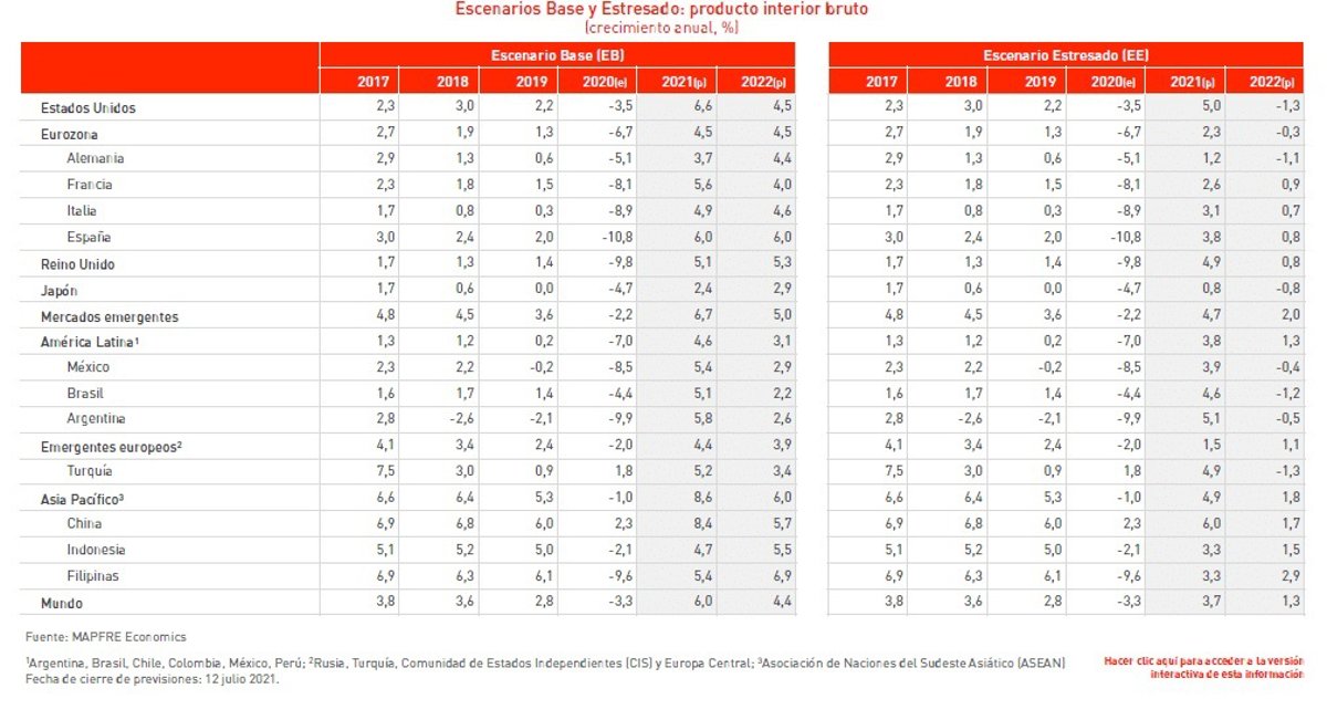 En cuando a la economía mundial, Mapfre Economics mantiene su previsión de que crezca un 6% este año y un 4,4% en 2022 en el escenario base, así como un 3,7% y un 1,3%, respectivamente, en el escenario estresado.