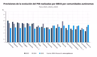 En concreto, el servicio de estudios de BBVA Research estima que País Vasco y Navarra (2,8%) y Galicia (2,5%) crecerán más que la media. Por otro lado, tras la mejora industrial entre 2023 y 2024, en Aragón (2,4%) y Castilla y León (2,2%) el empuje podría estar en línea o ser menor que el del conjunto nacional, al igual que en La Rioja (2,4%) y Asturias y Cantabria (2,1%).