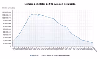 El número de billetes de 500 euros en circulación en España se situó en el mes de octubre en 12,3 millones, alcanzando su mínimo histórico en los 20 años desde que el euro entró en circulación, según los últimos datos provisionales publicados por el Banco de España.