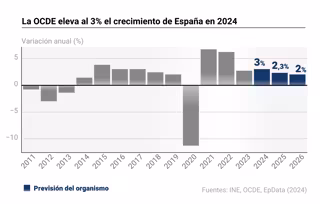La economía española crecerá este año y los dos siguientes muy por encima de la media estimada para la eurozona, según la Organización para la Cooperación y el Desarrollo Económico (OCDE), que ha revisado al alza su pronóstico de expansión del producto interior bruto (PIB) de España para 2024 al 3% desde el 2,8% y hasta el 2,3% desde el 2,2% el de 2025.