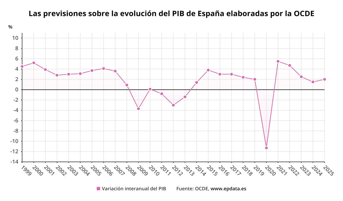 La Organización para la Cooperación y el Desarrollo Económico (OCDE) ha revisado una décima al alza su previsión de crecimiento para España en 2024, que estima ahora en el 1,5%, después de la expansión del 2,5% en 2023, mientras que mantiene la expectativa de un rebote de la actividad hasta el 2% para 2025.