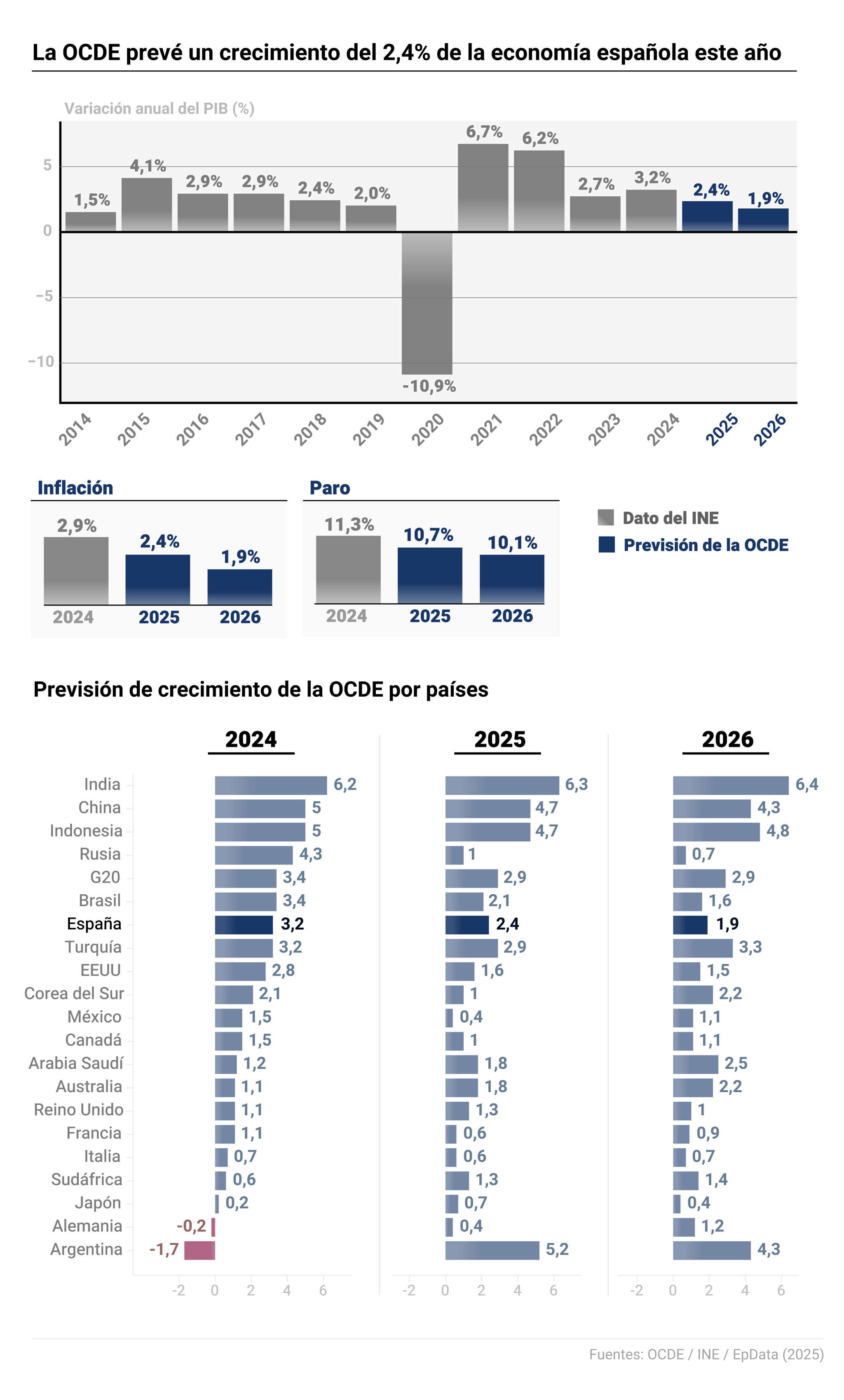 La Organización para la Cooperación y el Desarrollo Económico (OCDE)ha revisado dos décimas a la baja su pronóstico de crecimiento para España en 2025 y también para 2026, hasta el 2,4% y el 1,9%, respectivamente.