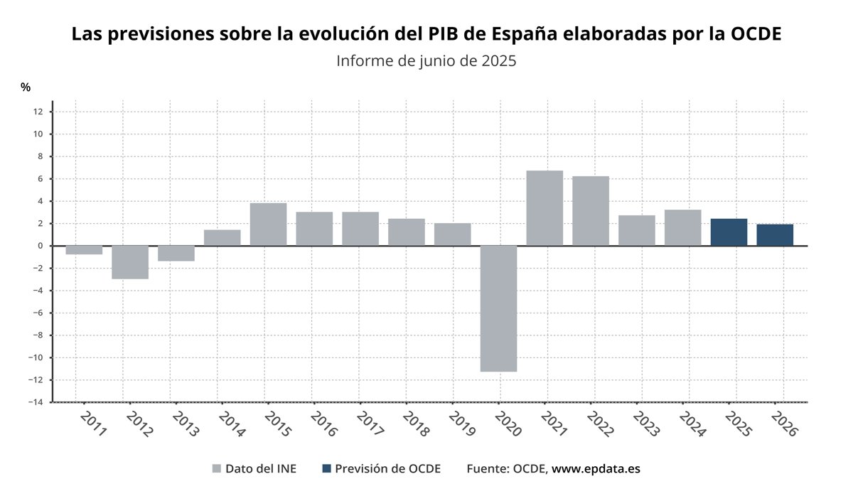 Según la OCDE, el crecimiento del Producto Interior Bruto (PIB) de España se moderará gradualmente este año y el próximo ante la desaceleración de las exportaciones a causa del impacto en la demanda internacional y el efecto de los aranceles implementados por Estados Unidos, aunque el ritmo de expansión de la economía española seguirá siendo "sólido" y muy por encima del estimado para las demás grandes economías avanzadas.