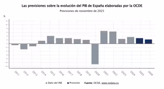 De este modo, las nuevas previsiones de la OCDE 'calcan' las últimas proyecciones del Gobierno español, que la semana pasada revisó al alza sus expectativas para este año y el siguiente, hasta el 2,9% y el 2,2%, respectivamente, mientras que estima un crecimiento del 2,1% para 2027 y 2028.