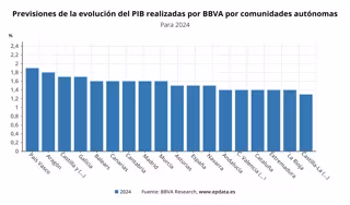 BBVA Research sitúa a País Vasco y Aragón como las dos comunidades autónomas que liderarán el crecimiento económico en 2024, con previsiones de un alza del PIB del 1,9% y 1,8%, respectivamente, según las estimaciones publicadas por el servicio de estudios del banco este lunes.
