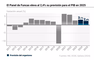 El Panel de Funcas ha revisado al alza su previsión de crecimiento para el Producto Interior Bruto (PIB) español en 2025, hasta el 2,4%, una décima más de lo esperado en noviembre, pero ha advertido de que la desaceleración de la economía respecto al impulso del año pasado (3,1%) se percibirá en el consumo público y en el sector exterior.