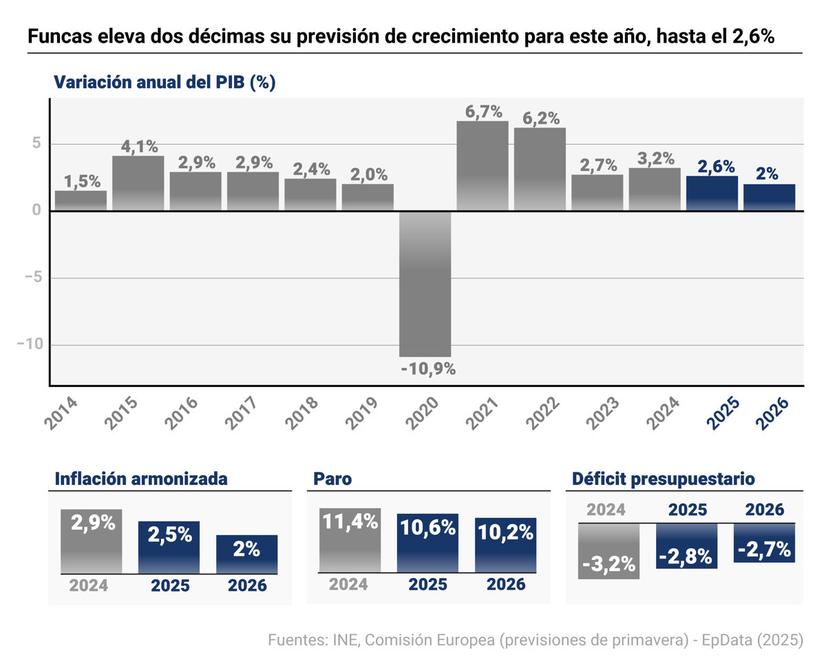 El panel de Funcas ha revisado al alza dos décimas la previsión de crecimiento de la economía española para este año, hasta el 2,6%, después de que el Instituto Nacional de Estadística (INE) situara el incremento del PIB del segundo trimestre en un 0,7%, dos décimas más de lo esperado por los panelistas.