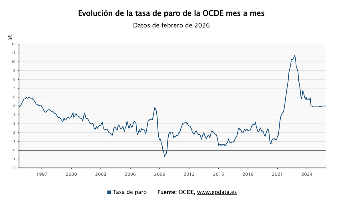 La tasa de paro de la Organización para la Cooperación y el Desarrollo Económico (OCDE) repitió el pasado diciembre en el 5%, en línea con lo hecho desde agosto de 2025, excepto octubre, mes en el que no se calculó el dato ante la falta de lecturas de Estados Unidos por su 'cierre' del Gobierno y de Suiza y Nueva Zelanda.