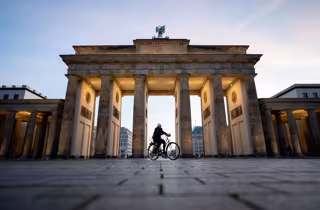Archivo - 17 December 2020, Berlin: A woman rides his bicycle across the empty March 18 Square at the Brandenburg Gate amid a nationwide lockdown that came into force on Wednesday to tackle the surging numbers of new coronavirus cases. Photo: Kay Nietfe - Kay Nietfeld/dpa - Archivo