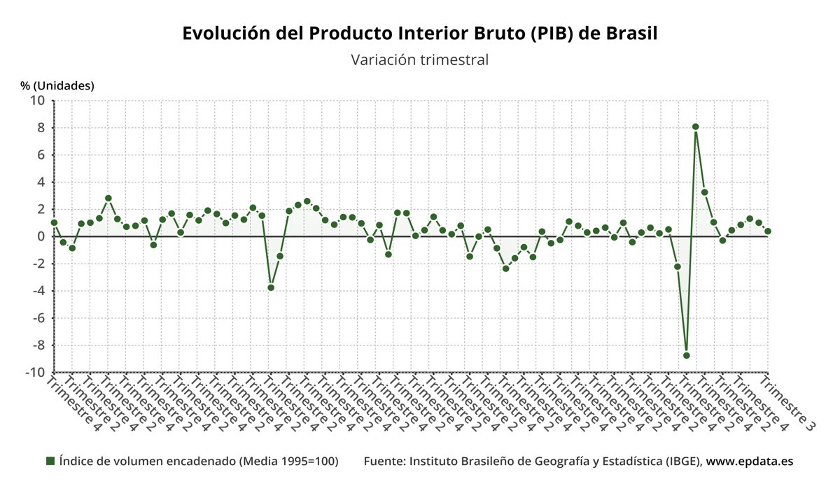 El Producto Interior Bruto de Brasil creció un 0,4% en el tercer trimestre del año en comparación con el segundo trimestre, según datos del Instituto Brasileño de Geografía y Estadística (IBGE).