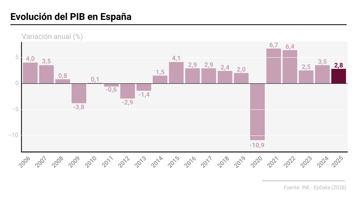 La economía española creció un 2,8% en 2025, siete décimas menos que en 2024, tras acelerar dos décimas su crecimiento en el último trimestre del año, hasta el 0,8%, según el avance de datos de Contabilidad Nacional publicados este viernes por el Instituto Nacional de Estadística (INE).