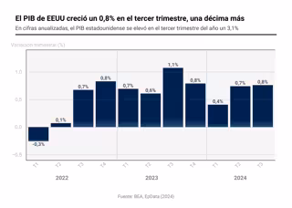La expansión de la economía de EE.UU. en el tercer trimestre se produjo, principalmente, por el aumento del consumo, las exportaciones, la inversión fija no residencial y el gasto del Gobierno federal, mientras que las importaciones, que son una sustracción en el cálculo del PIB, aumentaron entre julio y septiembre.