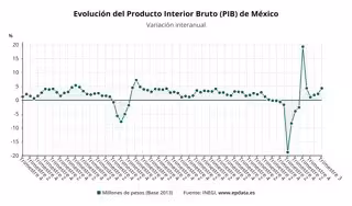 El Producto Interior Bruto (PIB) de México aumentó un 4,3% interanual en el tercer trimestre del año, mientras que su incremento desde el segundo trimestre fue tan solo del 0,9%, según datos del Instituto Nacional de Estadística y Geografía (Inegi).