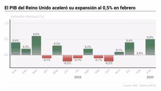 El producto interior bruto (PIB) del Reino Unido registró en febrero una expansión mensual del 0,5%, después del estancamiento registrado en enero, cuyo dato ha sido revisado una décima al alza, según ha informado este viernes la Oficina Nacional de Estadística (ONS).
