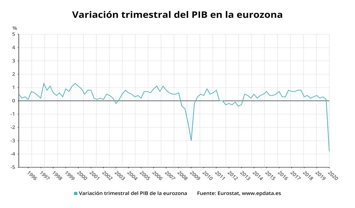 El producto interior bruto (PIB) de la zona euro registró en el primer trimestre del año una caída del 3,8% respecto de los tres meses anteriores, cuando había crecido un 0,1%, lo que representa la mayor contracción trimestral de la actividad de la eurozona en toda la serie histórica como consecuencia de impacto de las medidas de contención implementadas a partir de marzo para frenar la pandemia de Covid-19, según el dato preliminar publicado por Eurostat.