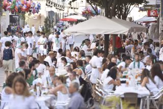 Decenas de personas en la terraza de un bar el día del lanzamiento del cohete anunciador de las Fiestas de San Lorenzo 2023, a 9 de agosto de 2023, en Huesca, Aragón (España). - Verónica Lacasa - Europa Press
