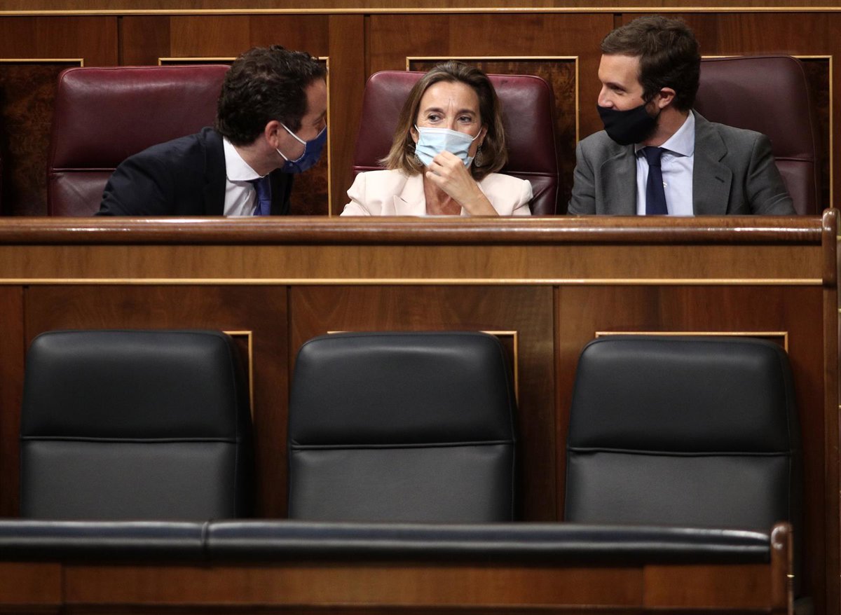 (I-D) Los diputados del PP Teodoro García Egea, Cuca Gamarra y Pablo Casado charlan en sus escaños durante una sesión plenaria en el Congreso - EUROPA PRESS/E. Parra. POOL - Europa Press