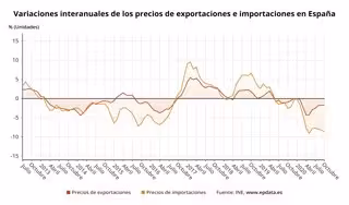 Con el dato de octubre, tanto los precios de las exportaciones como los de las importaciones encadenan nueve meses de tasas interanuales negativas, según datos publicados este viernes por el Instituto Nacional de Estadística (INE).