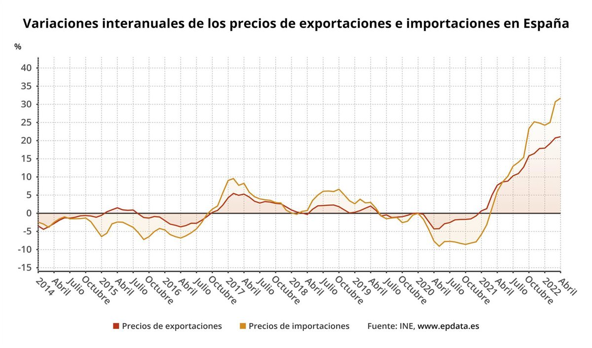 Por su parte, los precios de importación de los productos industriales se incrementaron un 31,7% en comparación con abril de 2021, tasa un punto superior a la del mes anterior y también la más alta desde enero de 2006.