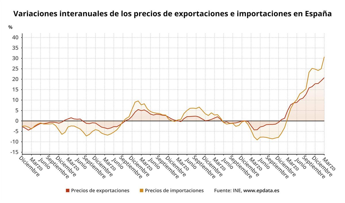Por su parte, los precios de importación de los productos industriales se incrementaron un 30,7% en comparación con marzo de 2021, tasa más de 5,5 puntos superior a la del mes anterior y también la más alta desde enero de 2006.
